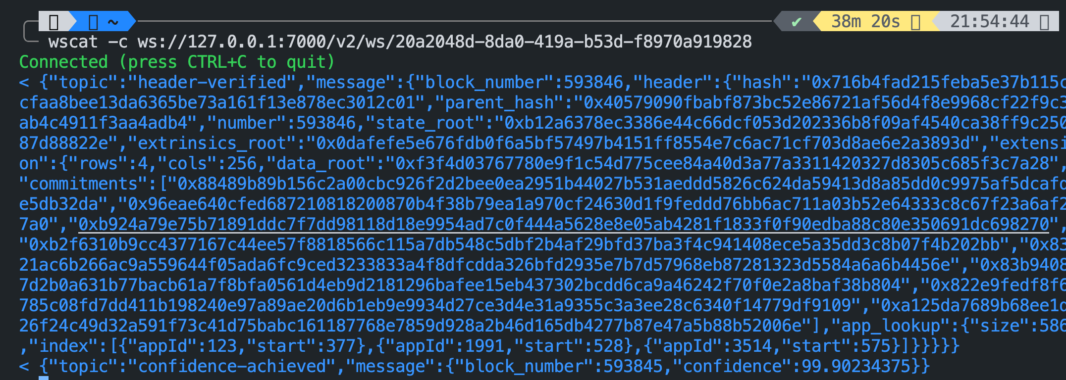 wscat -c ws://127.0.0.1:7007/v2/ws/{subscription-id}Your terminal should look something like this:
